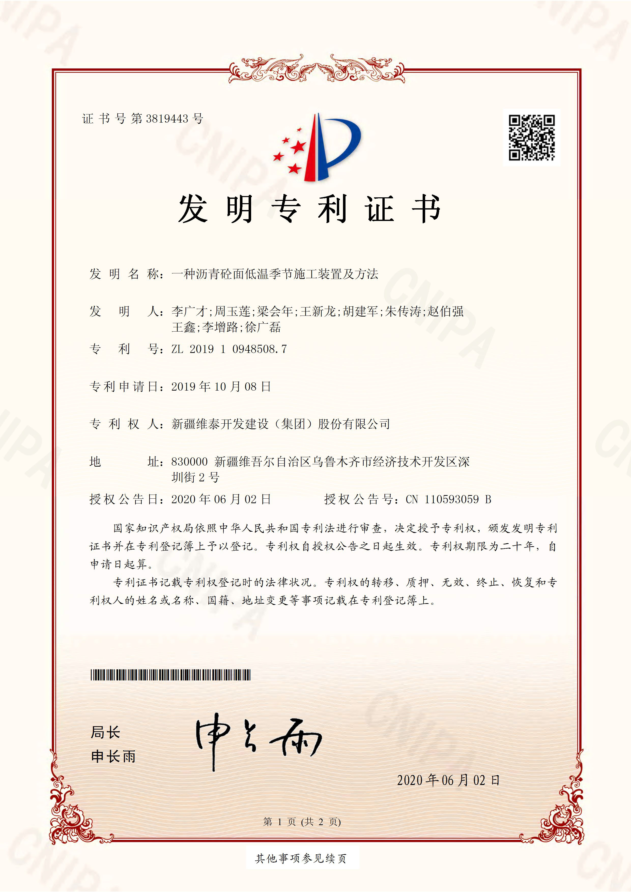 新疆维泰开发建设(集团)股份有限公司2020年、2021年度取得专利证书