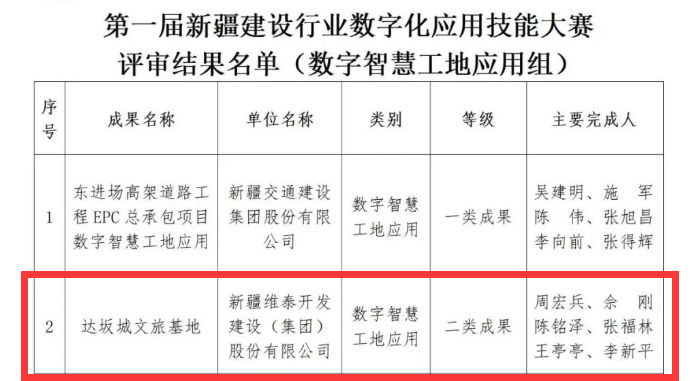 2023年11月29日,由新疆维吾尔自治区建筑业协会举办的“新疆维吾尔自治区第一届建设行业数字化应用技能大赛”在乌鲁木齐举行。本次大赛共有线上报名作品177个,涵盖参赛企业89家。经过激烈角逐,维泰股份园区总承包事业部选送的“达坂城文旅基地建设项目”数字智慧工地应用成果荣获第一届新疆建设行业数字化应用技能大赛二等奖。