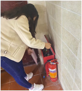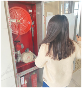 2、E1消防器材周边是否有遮挡物,经检查电梯出口消防箱旁有堆放物品,导致消防箱无法打开,现已立即整改;