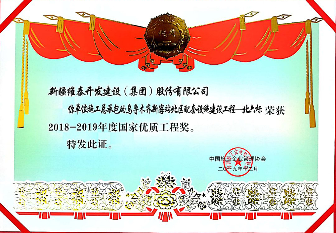新疆维泰开发建设(集团)股份有限公司承建的”乌鲁木齐新客站北区配套设施建设工程”2019年荣获2018-2019年度国家优质工程奖