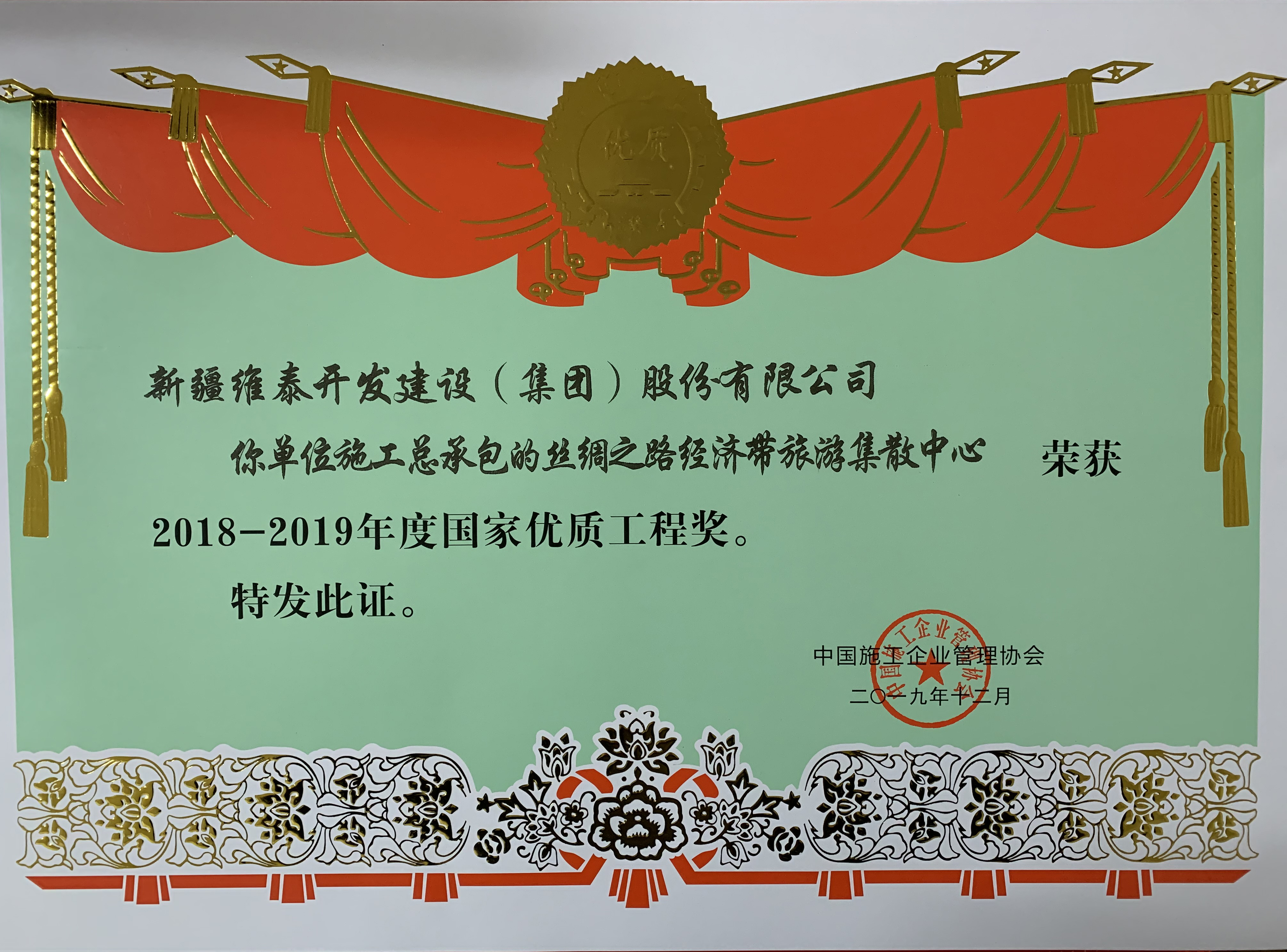 新疆维泰开发建设(集团)股份有限公司承建的”丝绸之路经济带旅游集散中心”工程2019年荣获国家优质工程奖-获奖奖状