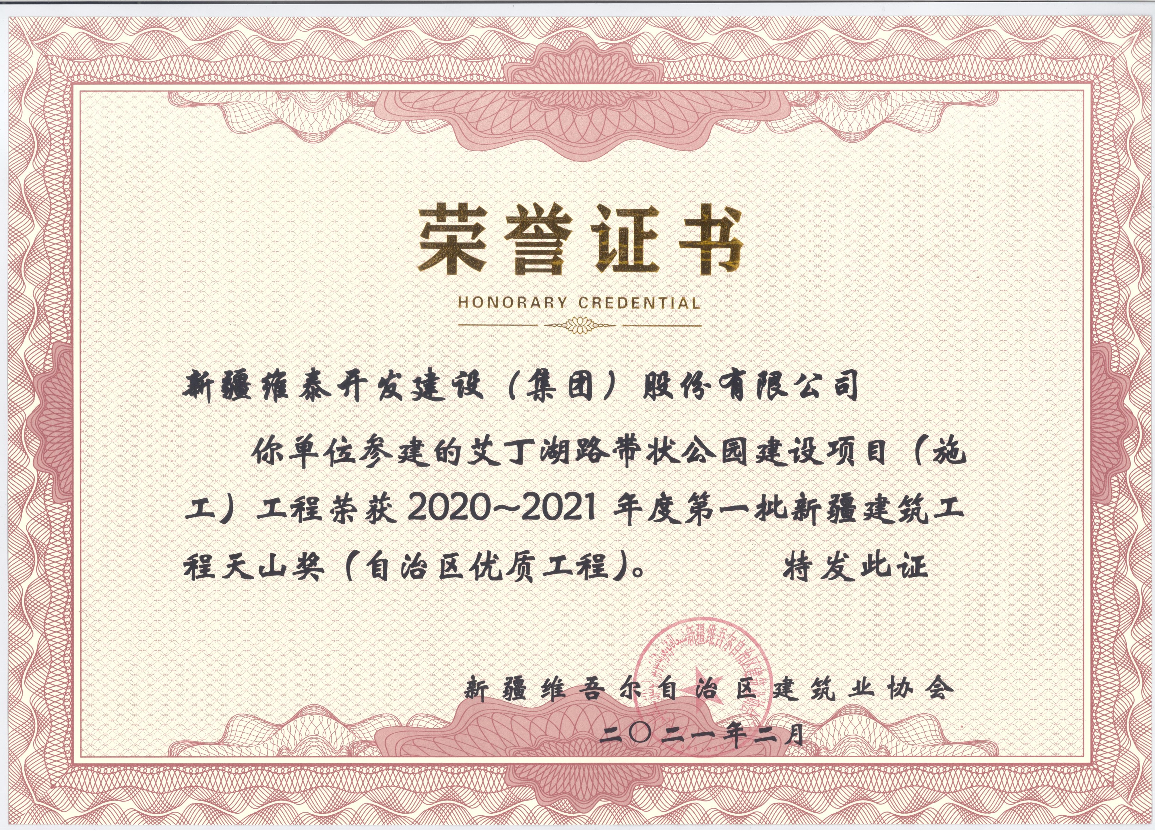 新疆维泰开发建设(集团)股份有限公司承建的“艾丁湖路带状公园建设项目”2021年荣获2020-2021年度第一批上半年新疆建筑工程天山奖(自治区优质工程)