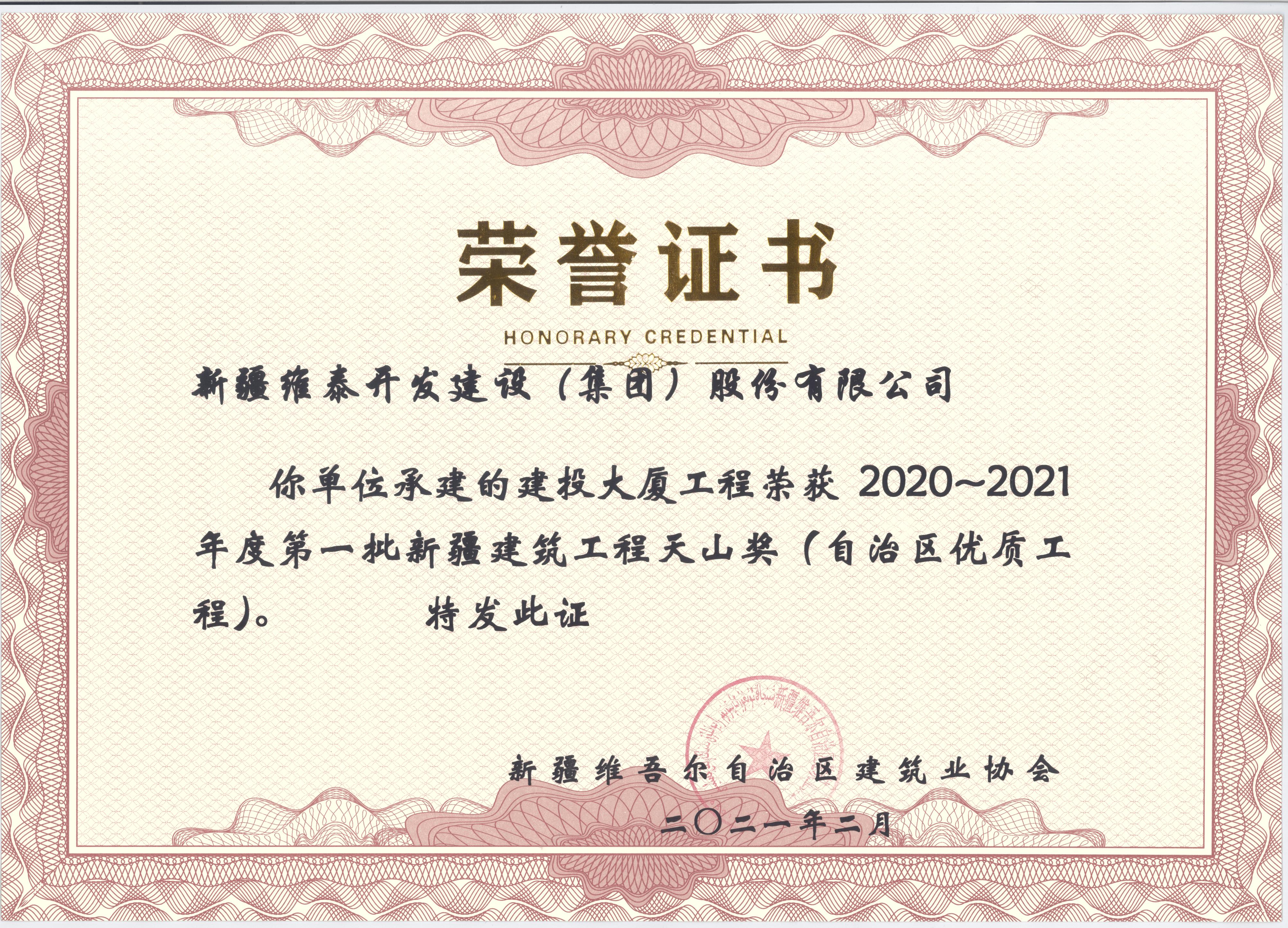 新疆维泰开发建设(集团)股份有限公司承建的“建投大厦”工程2021年荣获2020-2021年度第一批上半年新疆建筑工程天山奖(自治区优质工程)