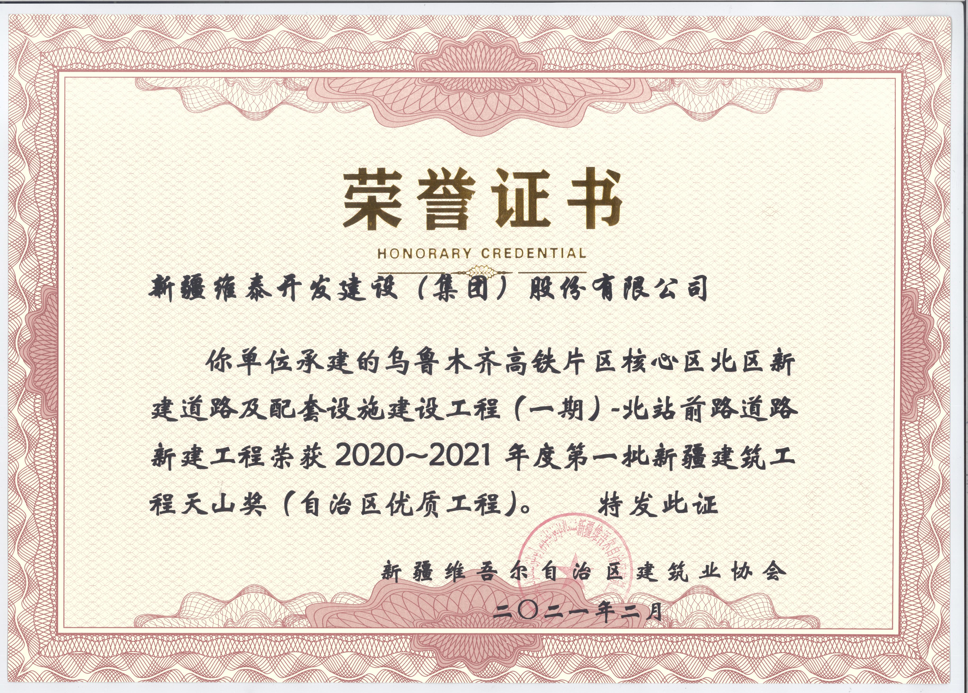 新疆维泰开发建设(集团)股份有限公司承建的“乌鲁木齐高铁片区核心区北区乌新建道路及配套设施建设工程(一期)北站前路道路新建工程”2021年荣获2020-2021年度第一批上半年新疆建筑工程天山奖(自治区优质工程)