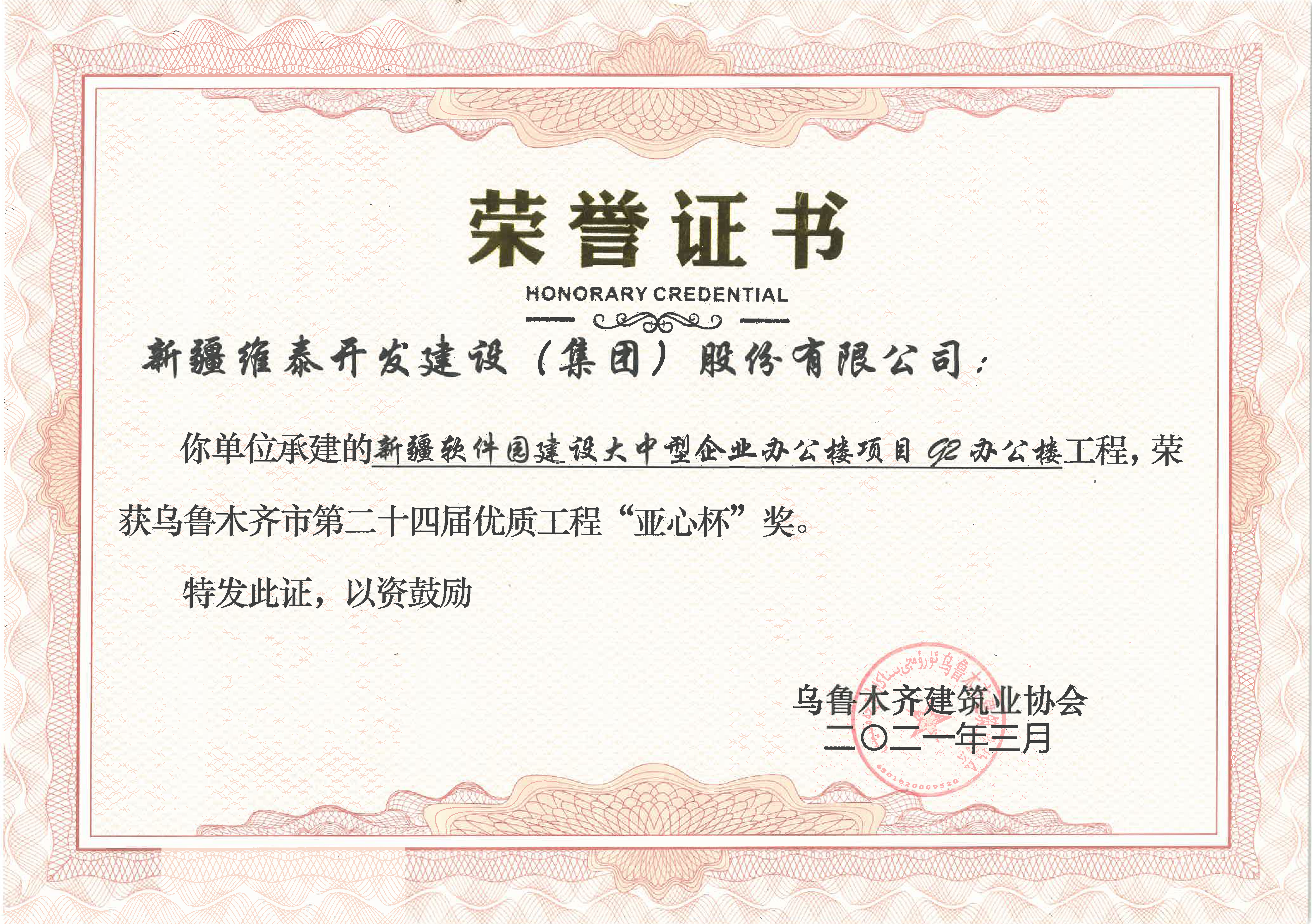 新疆维泰开发建设(集团)股份有限公司承建“新疆软件园建设中大型企业办公楼项目E2办公楼”荣获第二十四届优质工程亚心杯奖