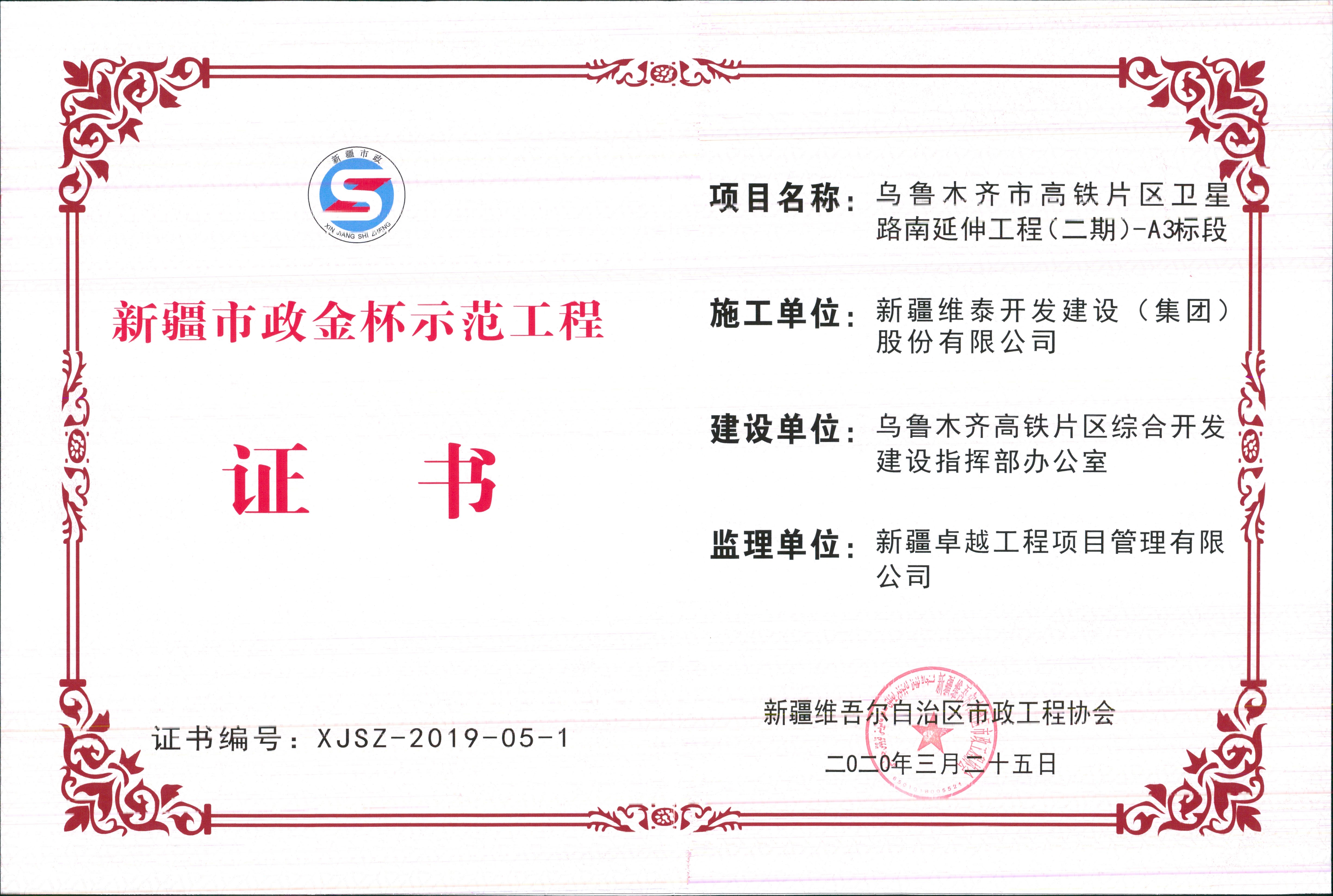新疆维泰开发建设(集团)股份有限公司承建“乌鲁木齐高铁片区卫星路南延伸工程(二期)-A3标段”2020年荣获“新疆市政金杯示范工程”奖