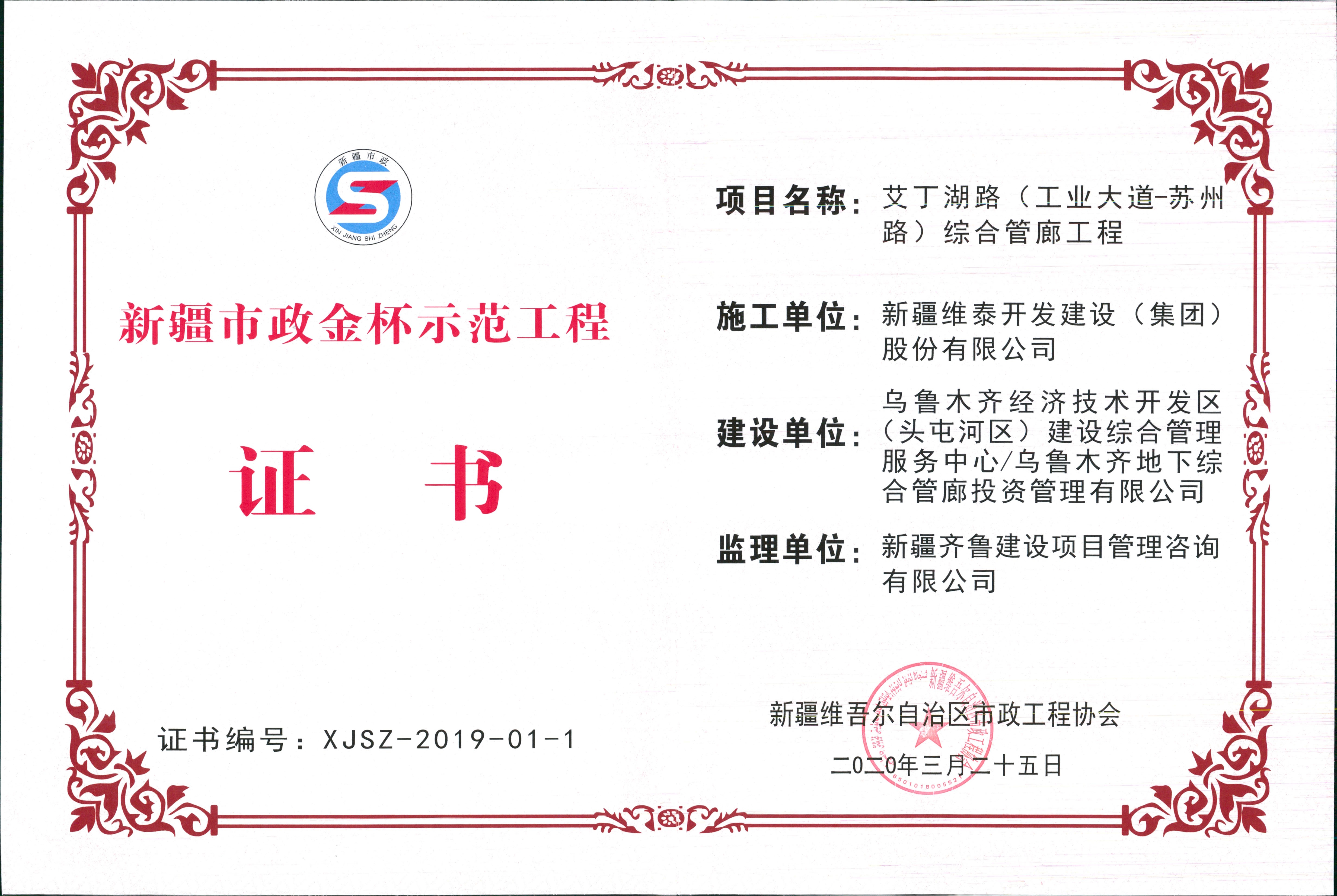 新疆维泰开发建设(集团)股份有限公司承建“乌鲁木齐艾丁湖路(苏州路--工业大道)综合管廊工程”2020年荣获“新疆市政金杯示范工程”奖