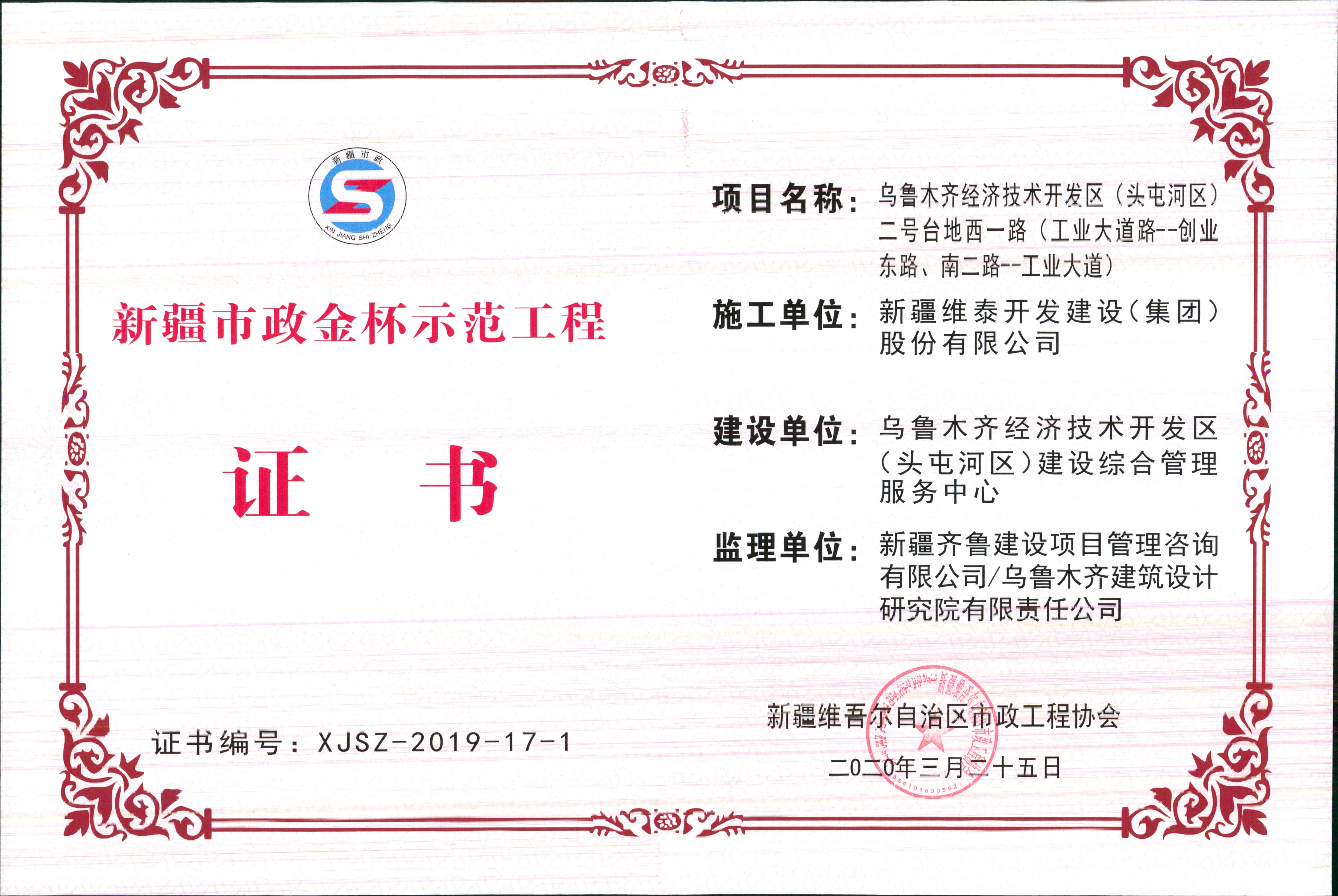 新疆维泰开发建设(集团)股份有限公司承建“乌鲁木齐经济技术开发区(头屯河区)二号台地西一路(工业大道-创业东路、南二路-工业大道)”2020年荣获“新疆市政金杯示范工程”奖